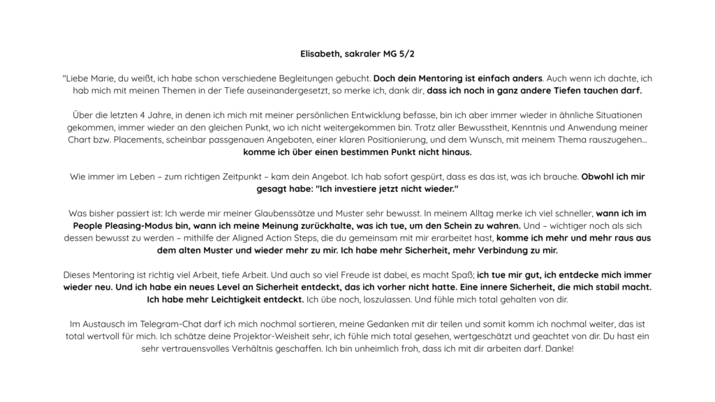 Aber bei einem Kennenlern-Call, hast du kurz in meine Charts geschaut und gesagt „also mental kriegst du das auf jeden Fall hin!“. Das hat mich schlagartig daran erinnert, dass ich schon ganz andere Zeiten gemeistert habe und das da jetzt aber einfach etwas ist, viel tiefer, viel stärker und das es endlich gesehen und gespürt werden will.