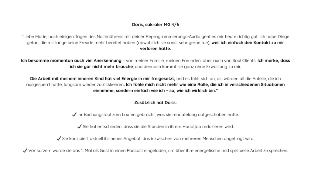 - vertiefende Hausaufgaben und Reprogrammierungen auf der Grundlage der gemeinsam erarbeiteten Themen und deiner Metaphysik.
