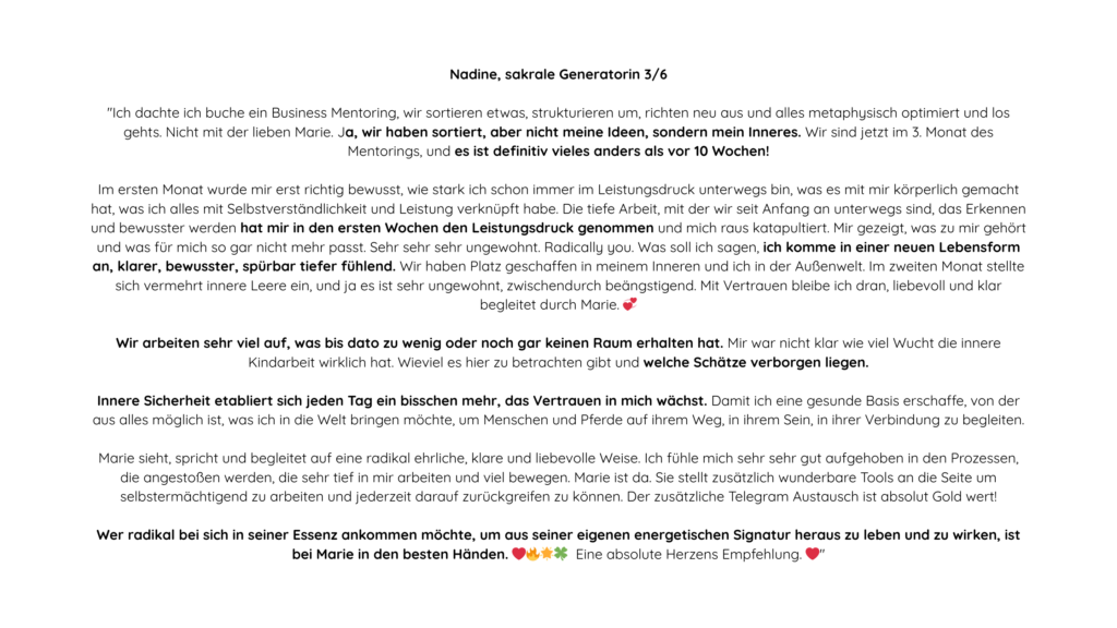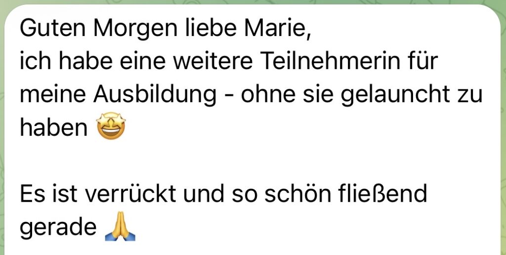 - Wenn es für uns beide ein Match ist, sicherst du dir deinen Mentoring-Platz. Du beginnst kurze Zeit später, dir das erfolgreiche Business im Einklang mit deiner Energie zu kreieren, das dich schon lange ruft.